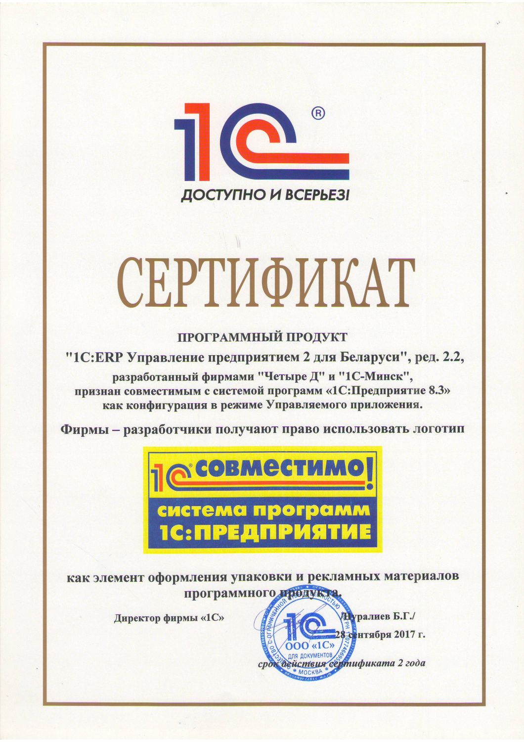 Программный продукт «1С:ERP управление предприятием 2 для Беларуси», ред. 2.2, разработанный фирмами «Четыре Д» и «1С-Минск» признан совместимым с системой программ «1С:Предприятие 8.3» как конфигурация в режиме Управляемого приложения.